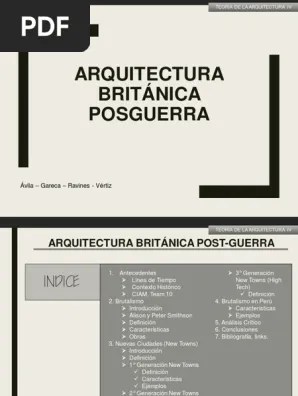 Arquitectura británica de posguerra grupo siglo xx. Se basó en nuevas tecnologías de construcción, en particular el uso de vidrio. Brutalismo en perú introducción características alison y peter smithson ejemplos … El racionalismo es desechado por considerarse un símbolo de modernidad de la … Arquitectura, y para ello se apoya en lofs actores socioeconómicos, en las tendencias teóricas de la arquittureca espaa ñoly acude aanál lisis de ejemplos concretos que demuestran la realidad del hecho, más allá de la pura especulación teórica. Construcción de nuevas ciudades en alrededores de londres para descongestionarlo.